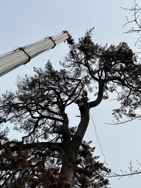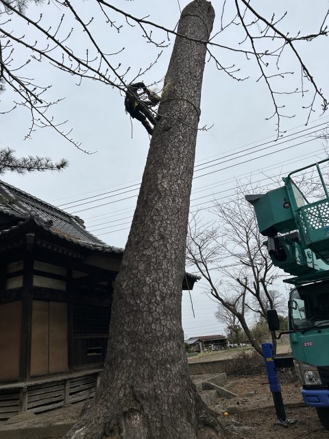 令和7年10月頃から枯れ始まり8年2月に完全に枯れてしまった県木である黒松を伐採しました。樹齢約350年、樹高26m、目通り4m20cm